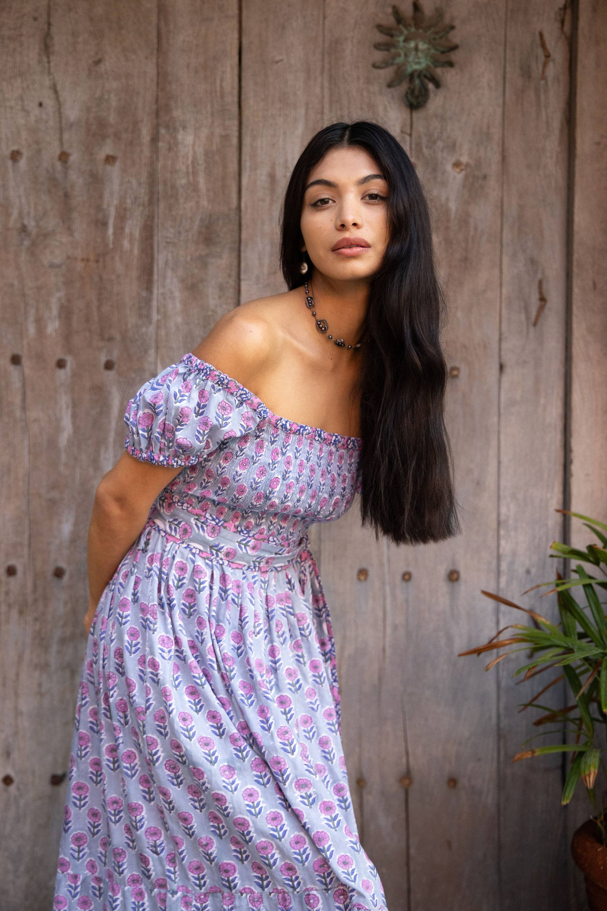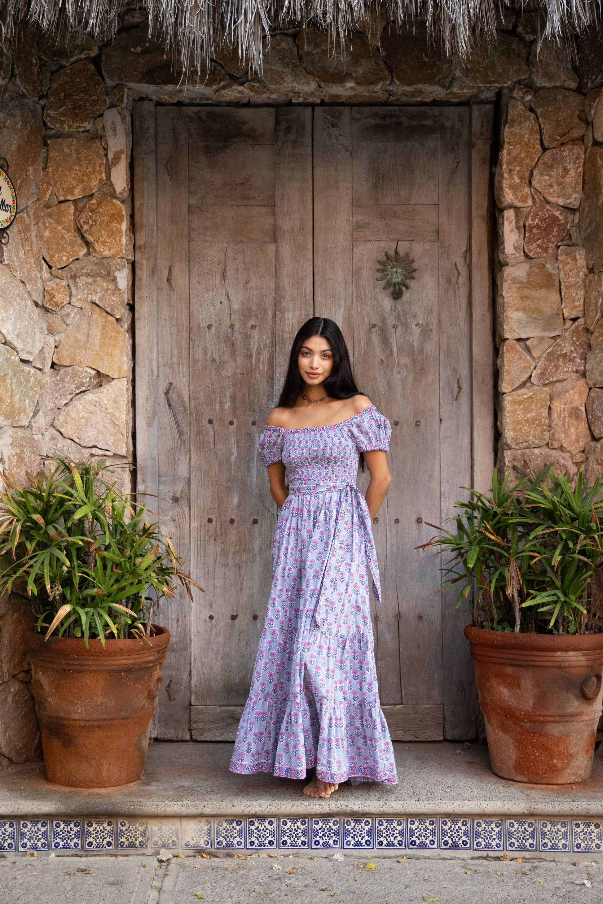 Introducing the Paloma block printed maxi, ideal for spring and summer outdoor gatherings. The bust features delicate smocking, the sleeves are elasticated and can be worn on or off the shoulder. It comes with a detachable belt adorned with matching piping.