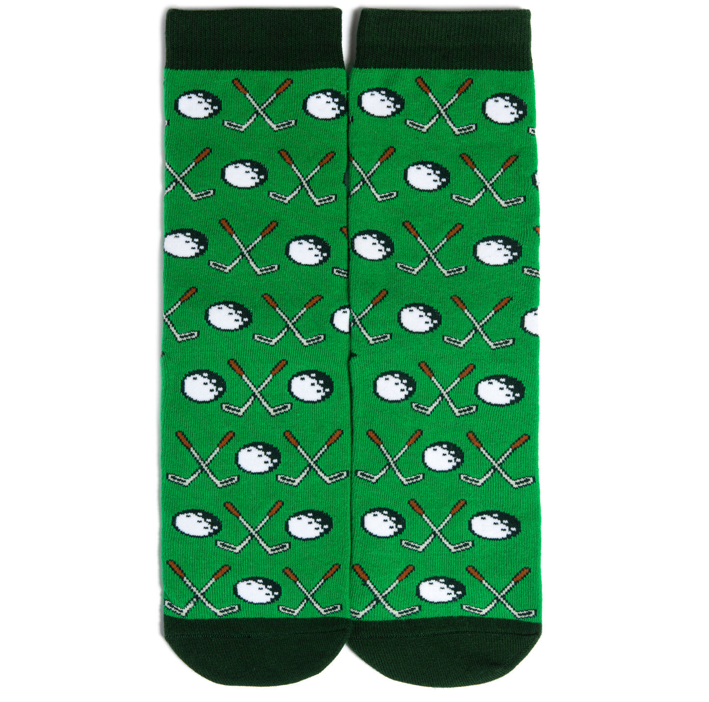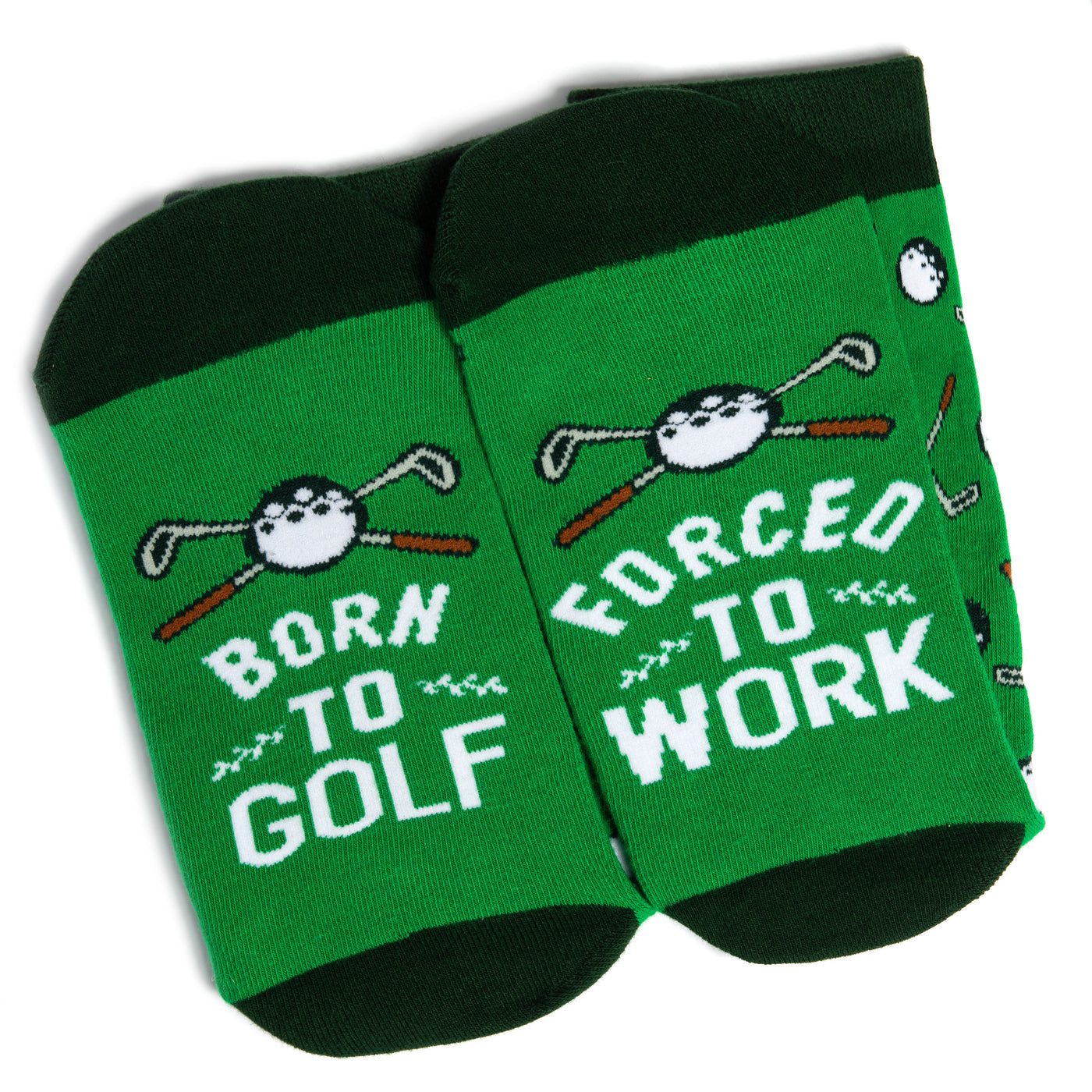 Introducing our dapper crew socks tailored for golf enthusiasts - the perfect blend of style for both work and the golf course. These socks showcase original, unique art featuring a stylish pattern of golf clubs and balls, accompanied by a hidden message guaranteed to bring a smile to any golf lover: "Born to Golf, Forced to Work."