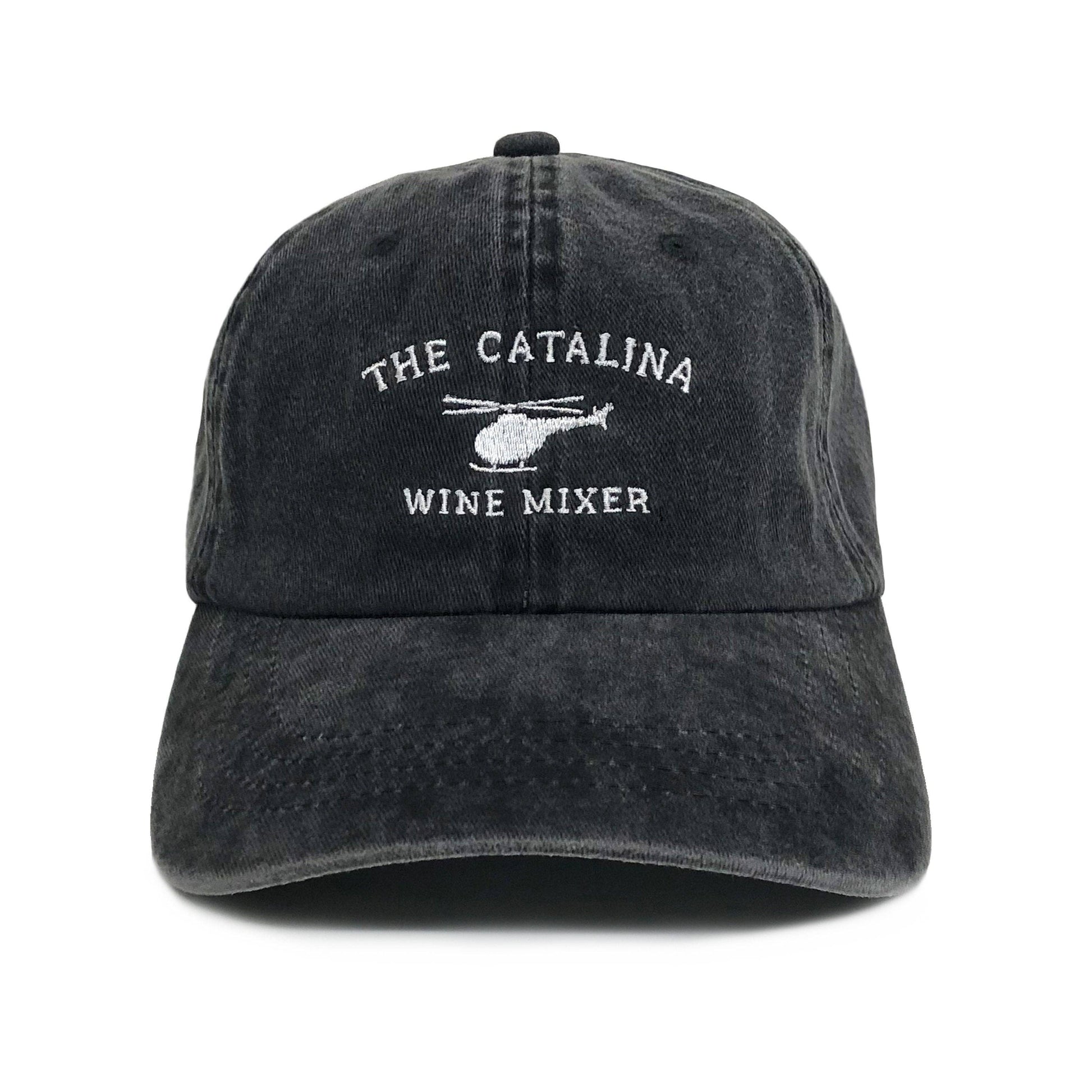 • washed black 6-panel dad hat • 100% cotton • adjustable strap • embroidered Catalina Wine Mixer emblem