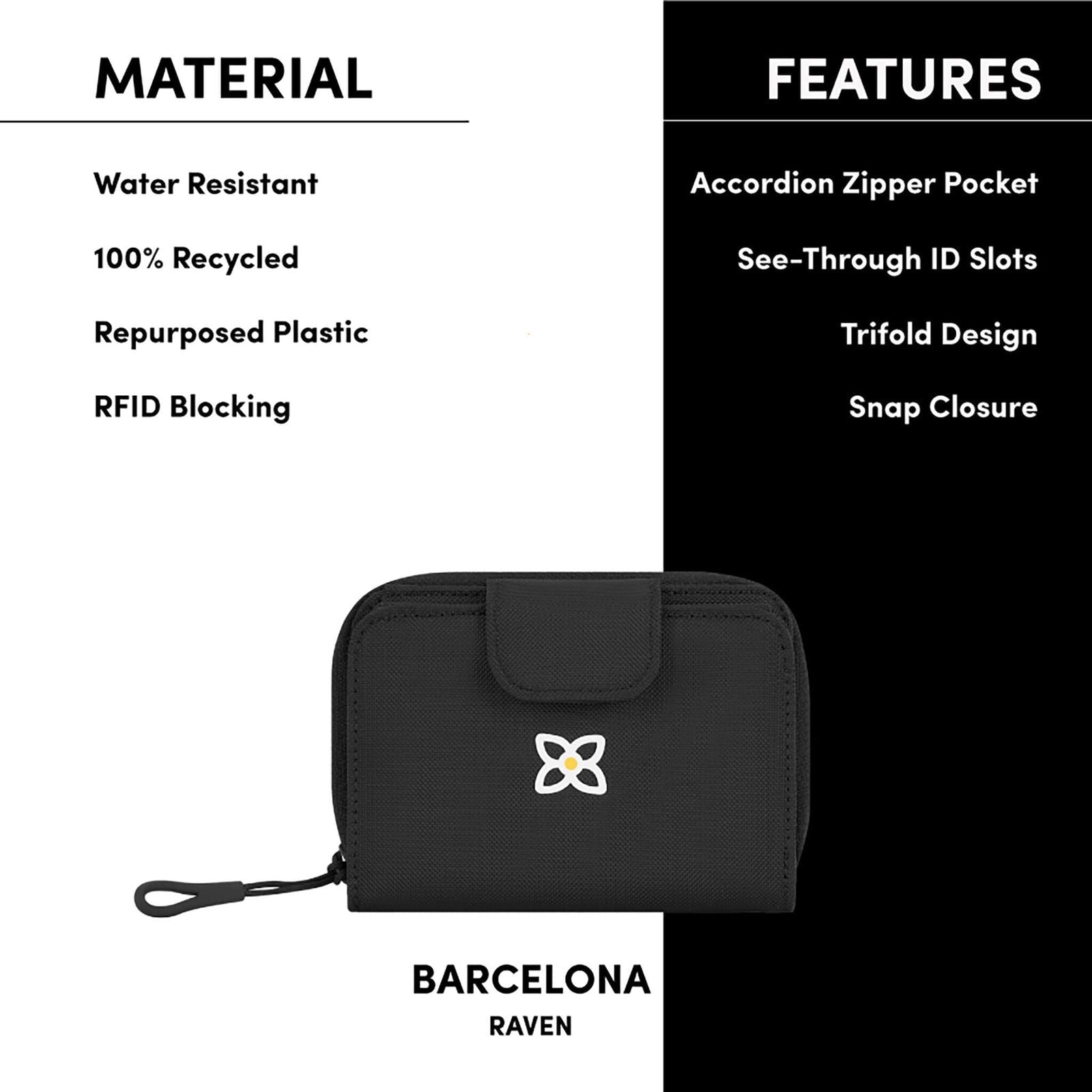 This small travel wallet is made from recycled material and has a compact design focused on organization and security. With RFID protection that blocks the signals used in cyber theft, the Barcelona will keep your credit cards safe on vacation and every day.