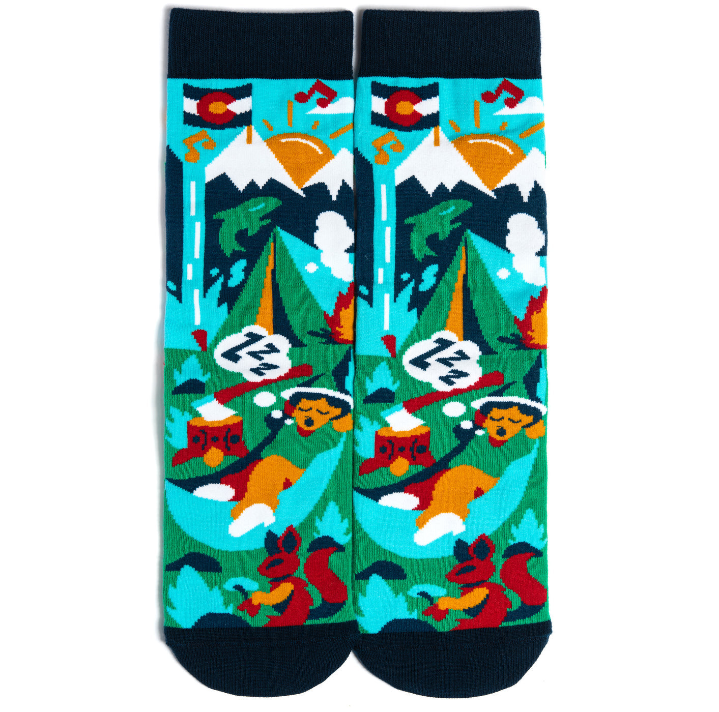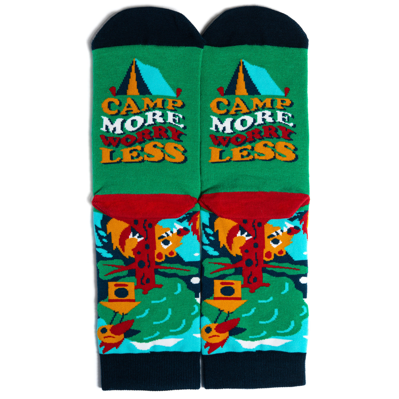 For the laid-back outdoorsy types, these funny socks are a must-have - the perfect blend of comfort and outdoorsy style. Featuring an original illustration showcasing iconic camp imagery, along with a hidden message that's sure to bring a smile to any camping enthusiast: "Camp More, Worry Less."