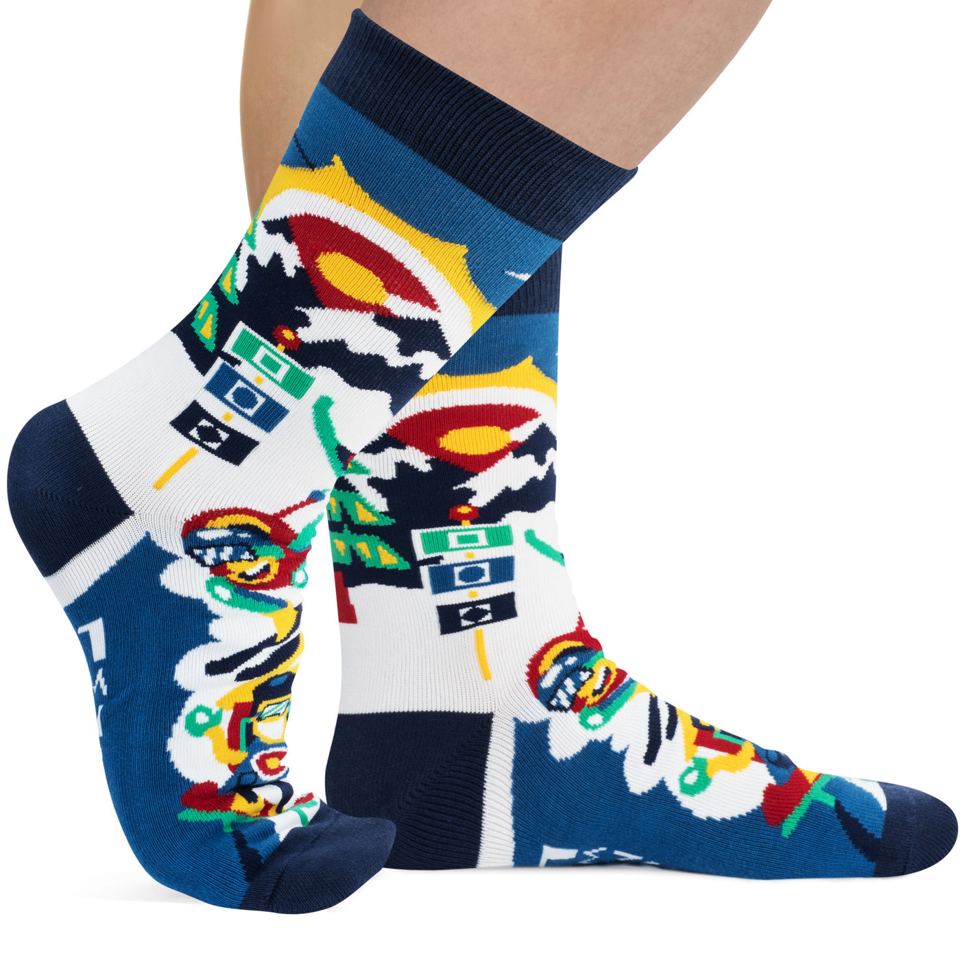 Calling all ski bums, snowboard addicts, and winter sport fanatics! Carve your worries away and elevate your winter apparel with a fresh pair of our "Ski More, Worry Less” socks. Made from a stretchy cotton blend, they’ll keep your feet warm and comfy as you hit the ski slopes or chill out in the cabin. The bright design showcases a rad skiing scene, reminiscent of a blue bird day on the slopes. It's an epic gift for the ski lover in your life - encouraging them to explore the mountain terrain worry-free.