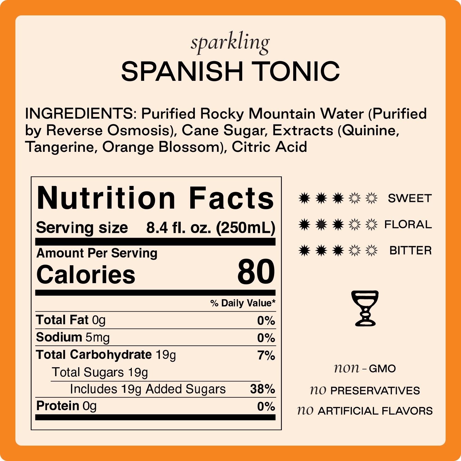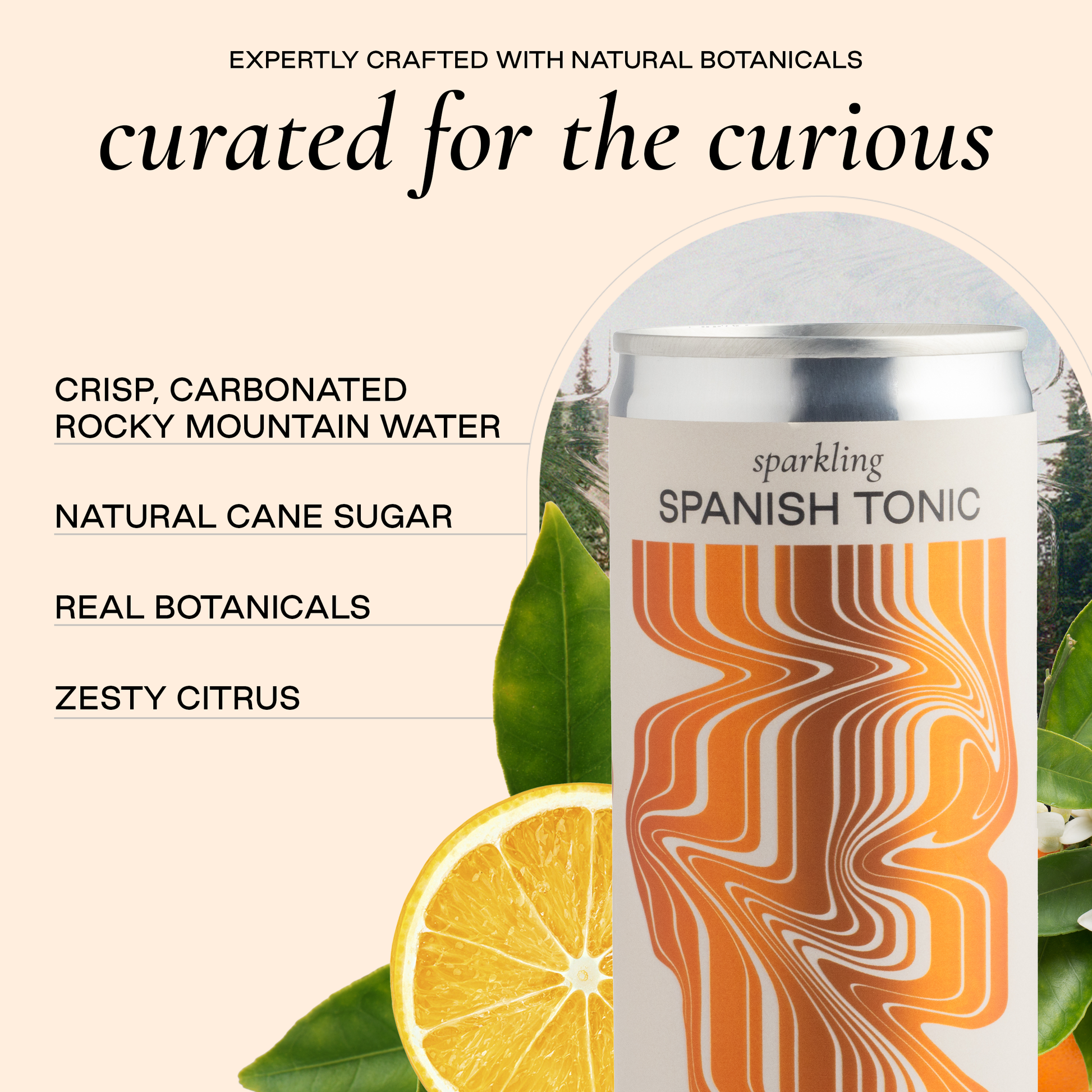 Our Spanish Tonic brings bright botanicals for bold flavor, including vibrant tangerine and fragrant orange blossom. Crisp, refreshing Rocky Mountain water carbonated at high altitude for lively champagne-sized bubbles.