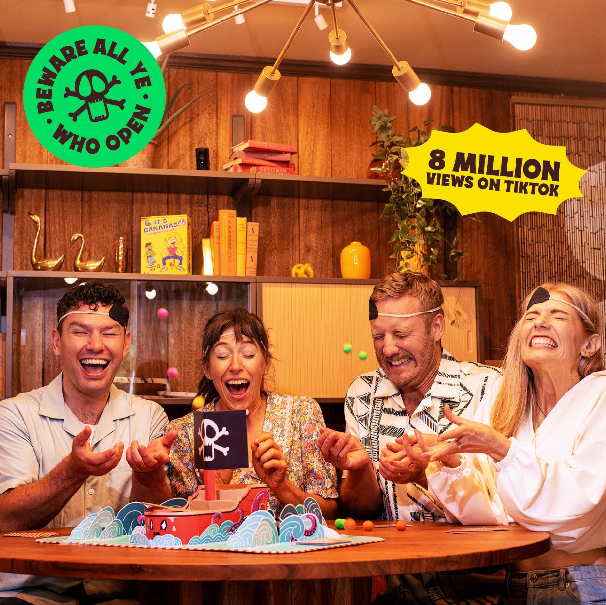 Fire In The Hole is part card game, part dexterity game. Open yer pop-up ship, strap on an eye patch, play yer carrrd, then fire yer cannonball. First to link 4 cannonballs be the winner.