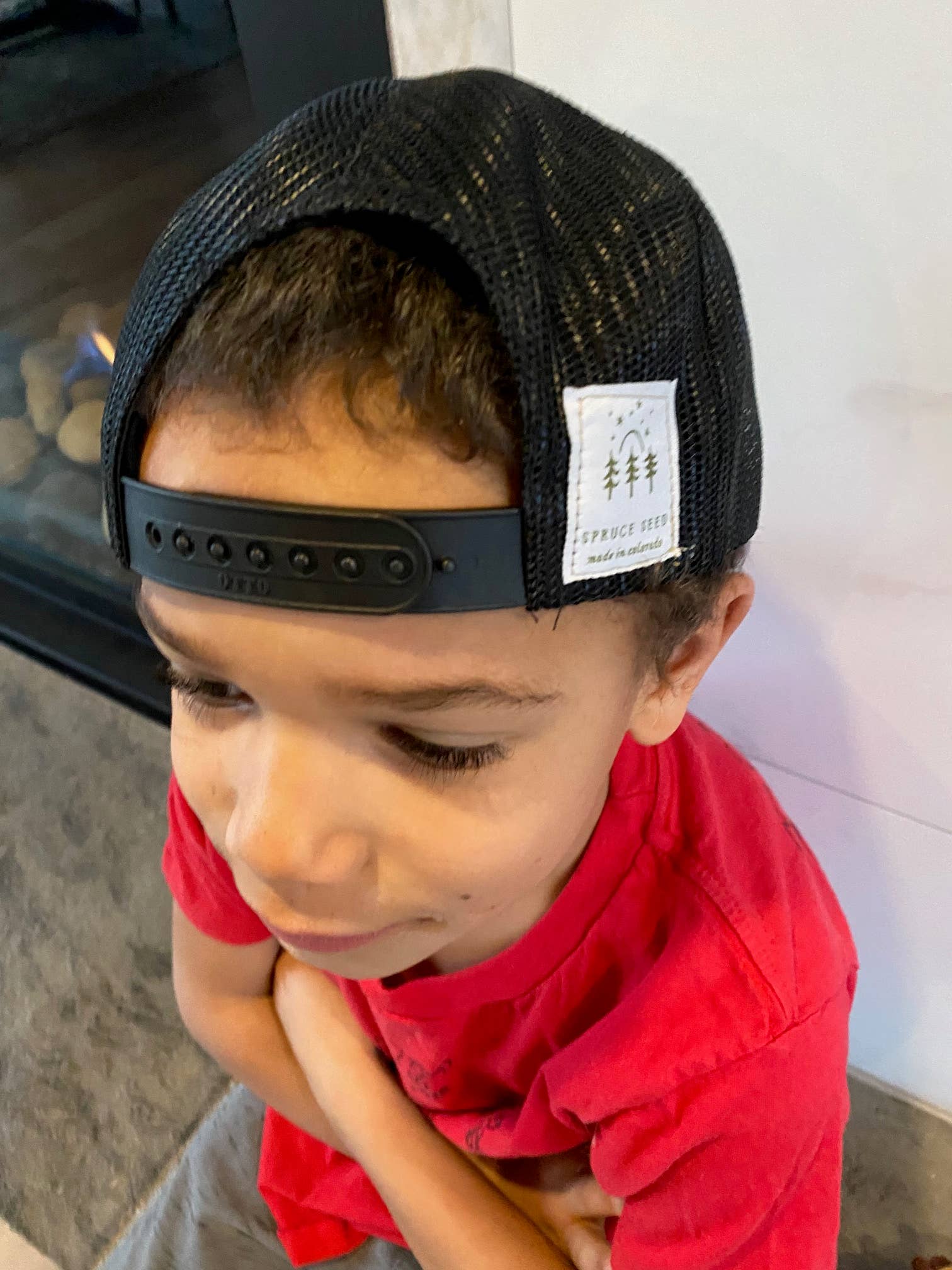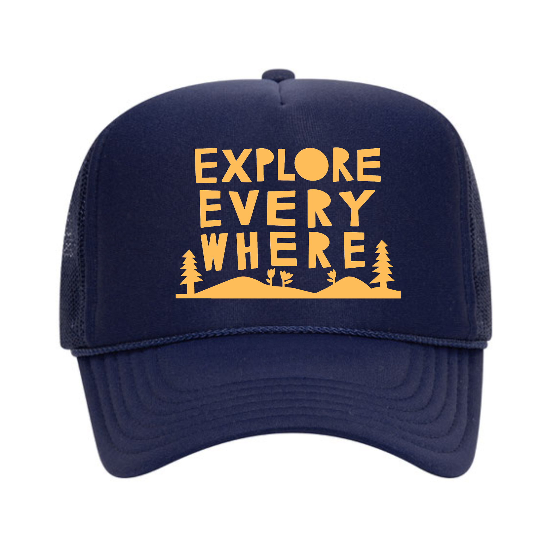 Explore Everywhere ! - Kids Trucker Hat in Navy Blue Toddler + Youth sizes. Snapback with Adjustable Mesh Back. Outdoor Adventure in Nature Hat.