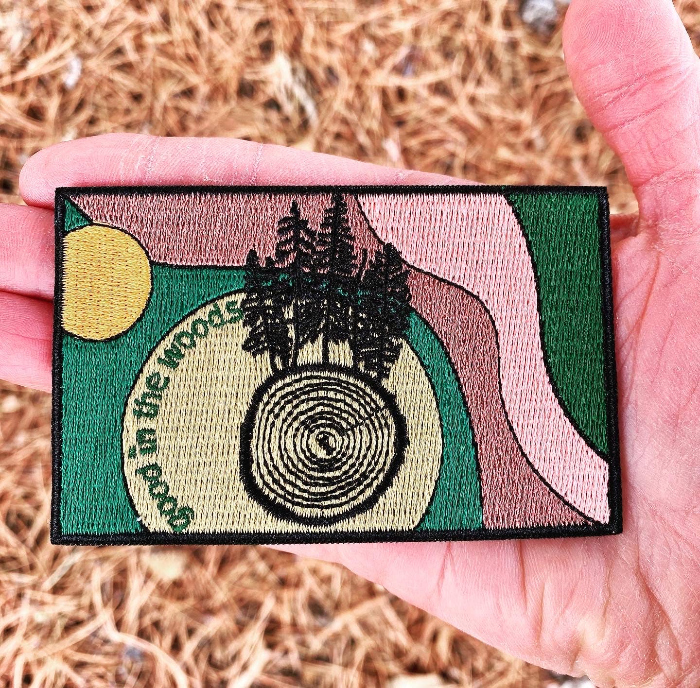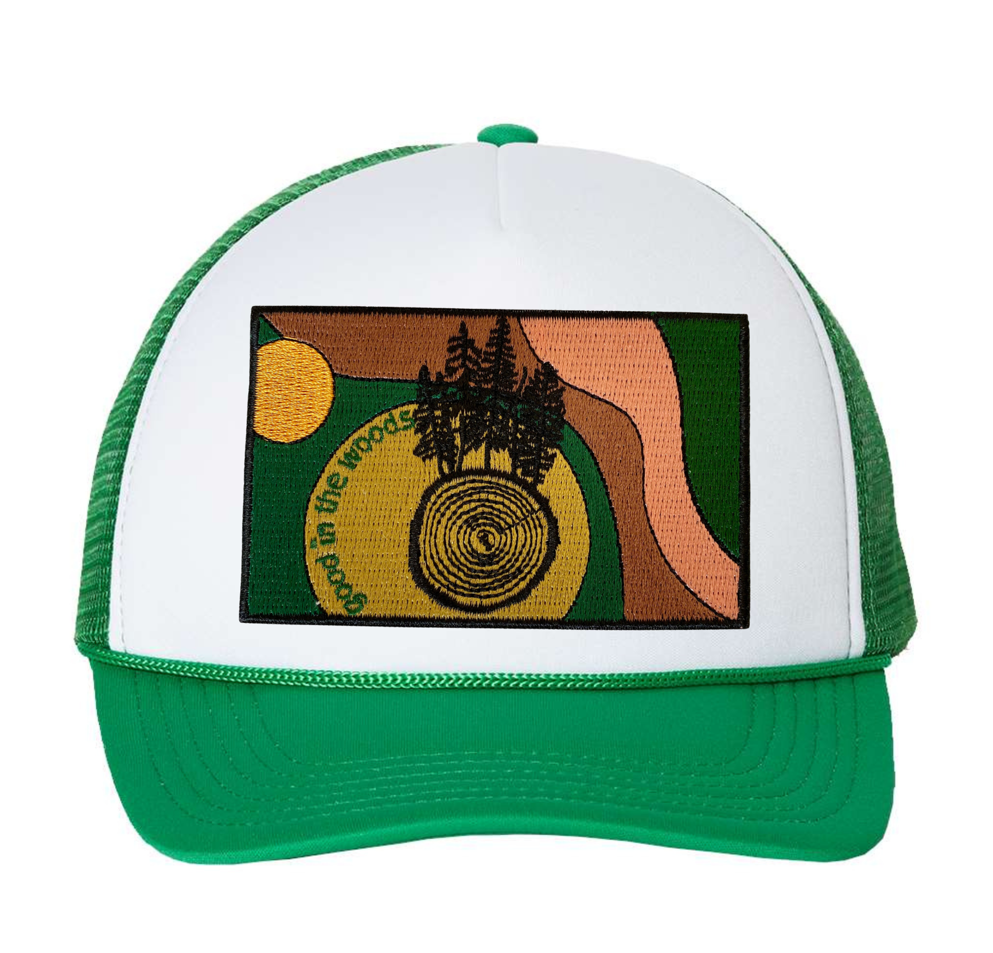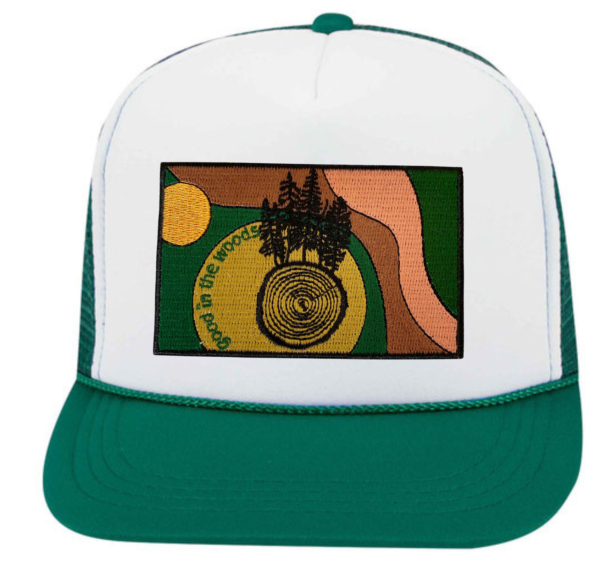 Good in the Woods Embroidered Patch- Kids Trucker Hat in Teal Youth (Kelly Green toddler) Snapback. Woods Tree theme.