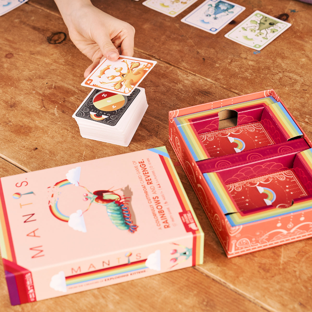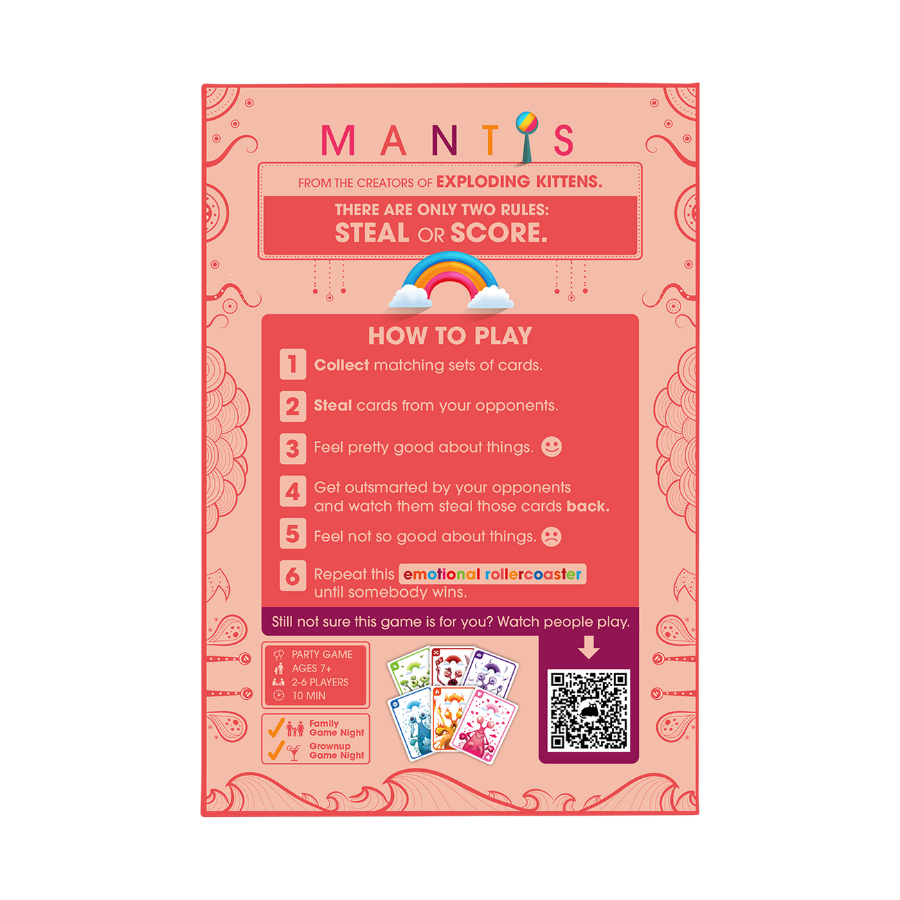Designed for both kids and adults with the easy-to-learn fun of a classic matching game and the depth of gin rummy. There are only two rules: Steal or Score. You collect matching sets of cards by stealing from your opponents. You feel good about things, then not so good about things as opponents steal your cards back. Repeat this emotional rollercoaster until somebody wins the game.