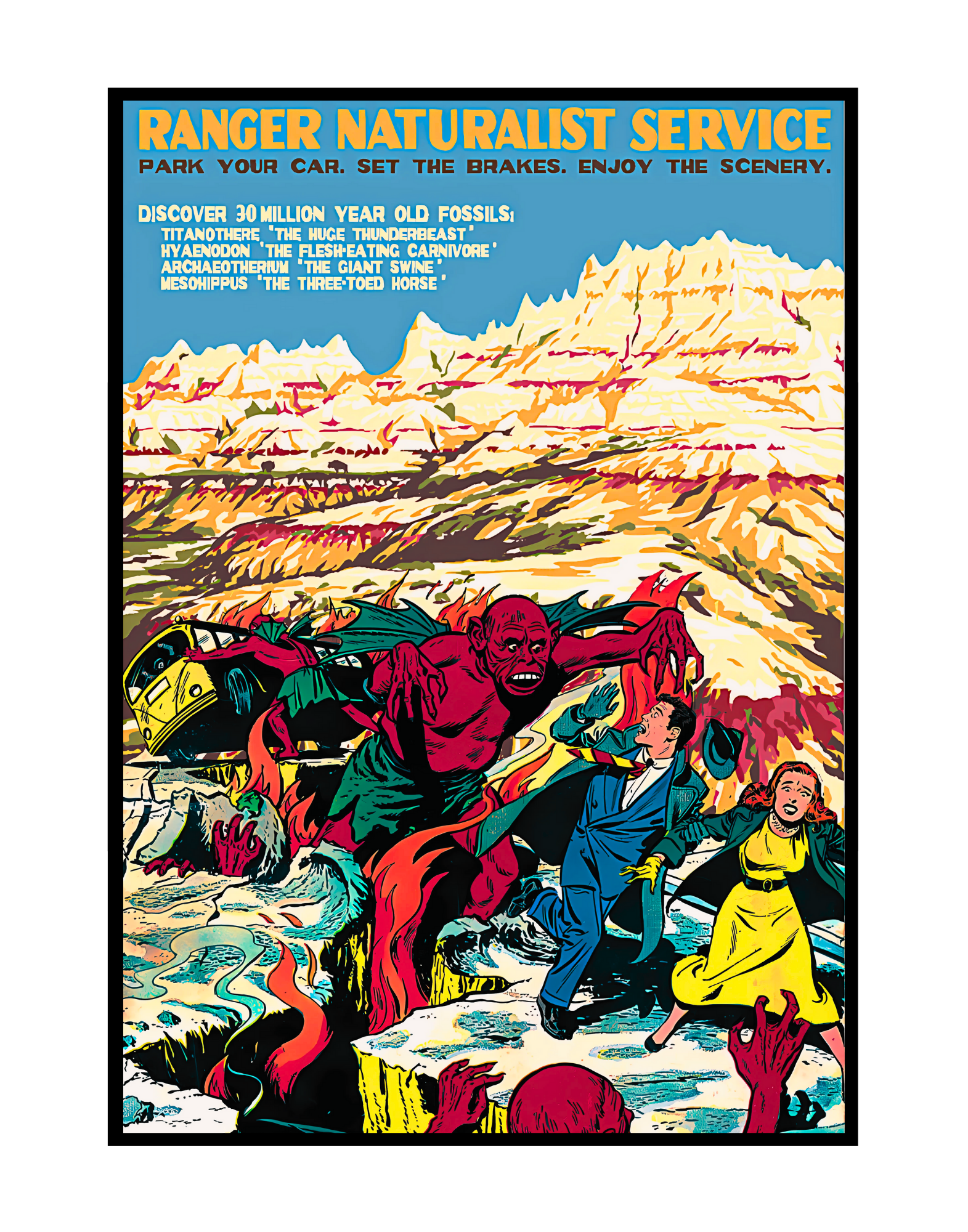 This dynamic art piece fuses the raw, rugged beauty of the Badlands with the chaotic intensity of Golden Era comics. In the midst of the sweeping, jagged landscapes, comic-book demons emerge from the earth, attacking unsuspecting adventurers. The iconic rock formations are alive with dramatic action—heroes and explorers, armed and desperate, fight back against the dark, looming creatures. The deep reds and earthy tones of the Badlands clash with the bright, exaggerated colors of the comic world, amplifying the tension and chaos. It's a visually electrifying work that transforms the natural world into a battleground, where the fierce, otherworldly forces of evil meet the heroic struggle for survival in an epic showdown.