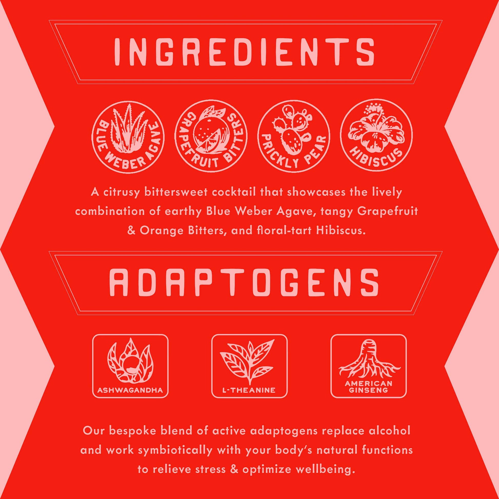 A citrus and bittersweet cocktail that showcases the lively pairing of Organic Blue Weber Agave, Prickly Pear Cactus Fruit, Grapefruit & Orange Bitters, Lime juice, floral-tart Hibiscus and Desert Botanicals.