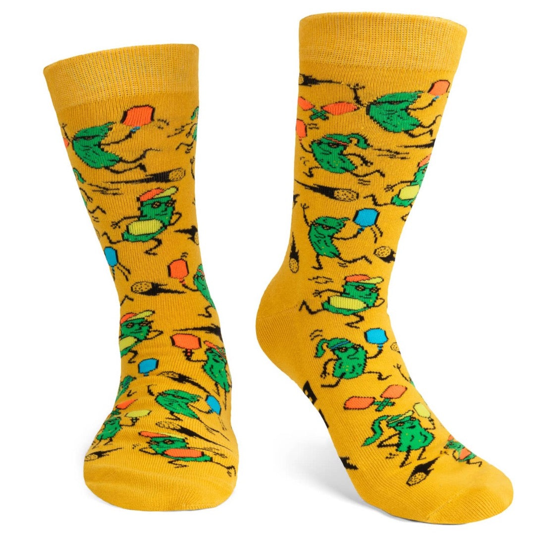Look swag and feel good too! These Pickleballer socks are the perfect way to show off your baller status. Whether you're a pro, a weekend warrior, or a more casual pickleball player, these funny socks will have you looking and feeling game-ready. The colorful, hand-drawn design features pickles playing the sport in a rich golden hue. These ultra-soft socks made from a premium quality cotton are the gold standard when it comes to novelty socks. They'll have your feet feeling like a million dollars both on and off the pickleball court. Be a good sport and gift a pair to the pickleball lover in your life. You'll not only make 'em laugh but they'll be proud to sport these socks when it's game time!