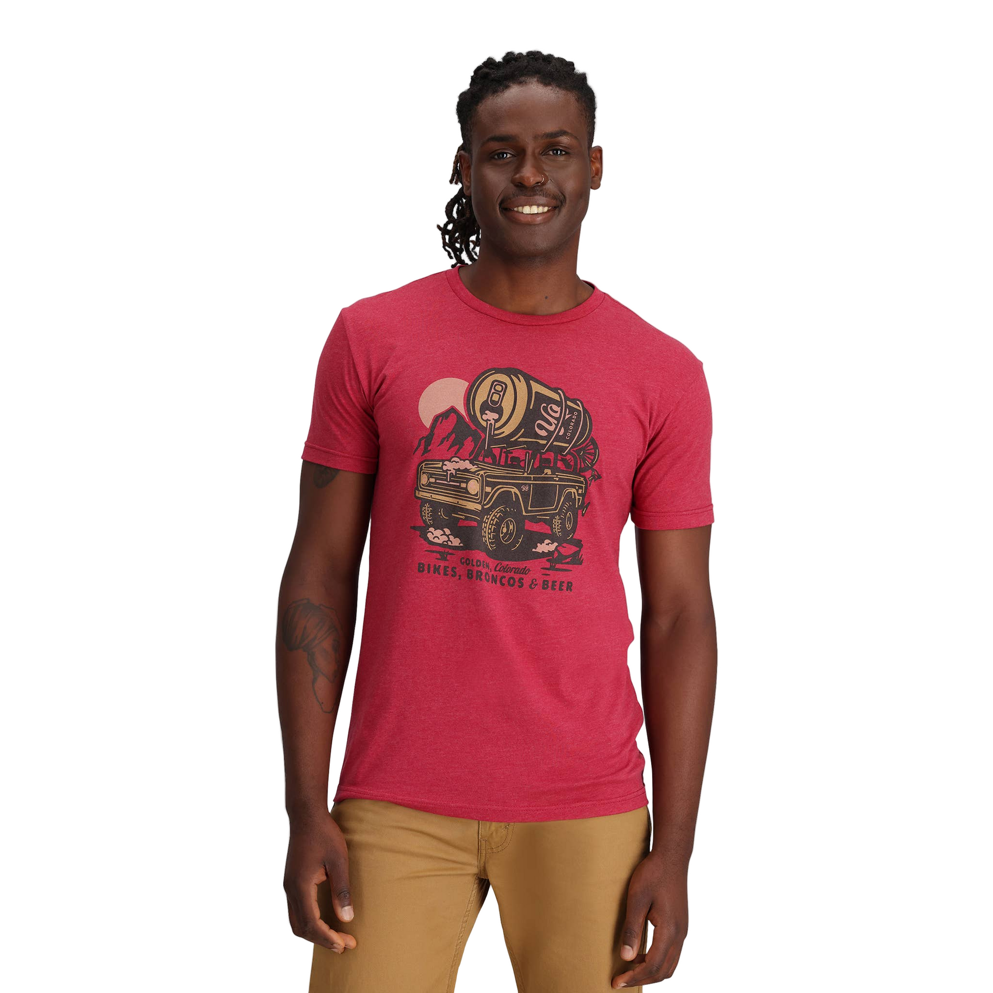 The Triple B's - Bikes, Broncos, and Beer. Something you'll see quite a bit of around these parts. We're celebrating with this cozy short sleeve tee in heather red.