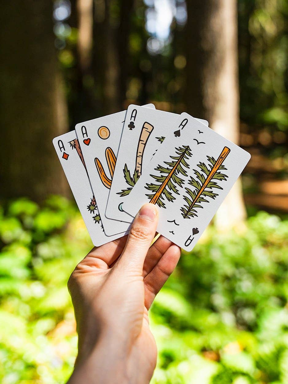 Grab your best buds (and maybe some snacks and cold drinks, too) and head out into nature to get some fresh air and have some fun with this deck of Wild Playing cards made from eco-conscious materials! 56 card deck Crafted from sustainable forest paper, starch-based laminating glue, and vegetable-based printing inks Recyclable Custom illustrations on all face cards!